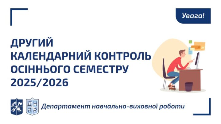 Нагадуємо! Другий календарний контроль осіннього семестру 2025/2026 буде проведено, щоб студенти, викладачі і кафедри могли бачити повну картину щодо стану виконання індивідуальних навчальних планів.